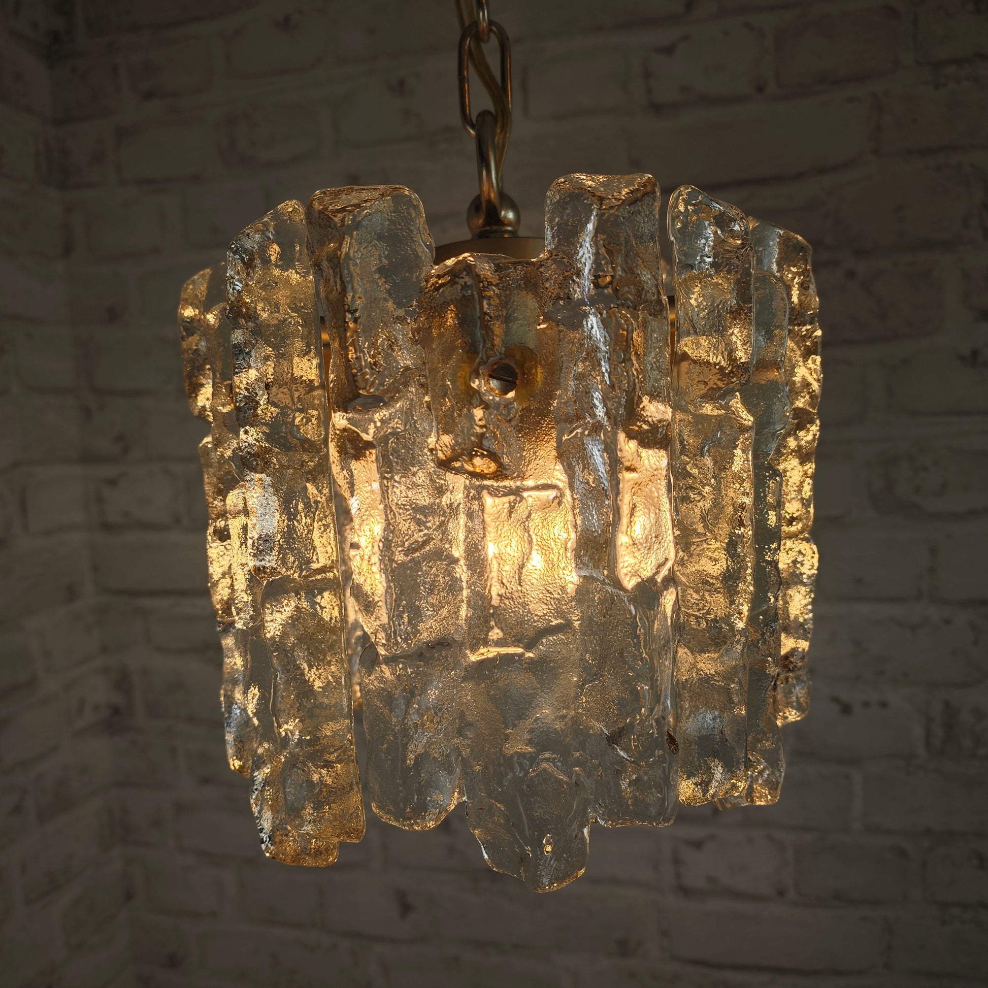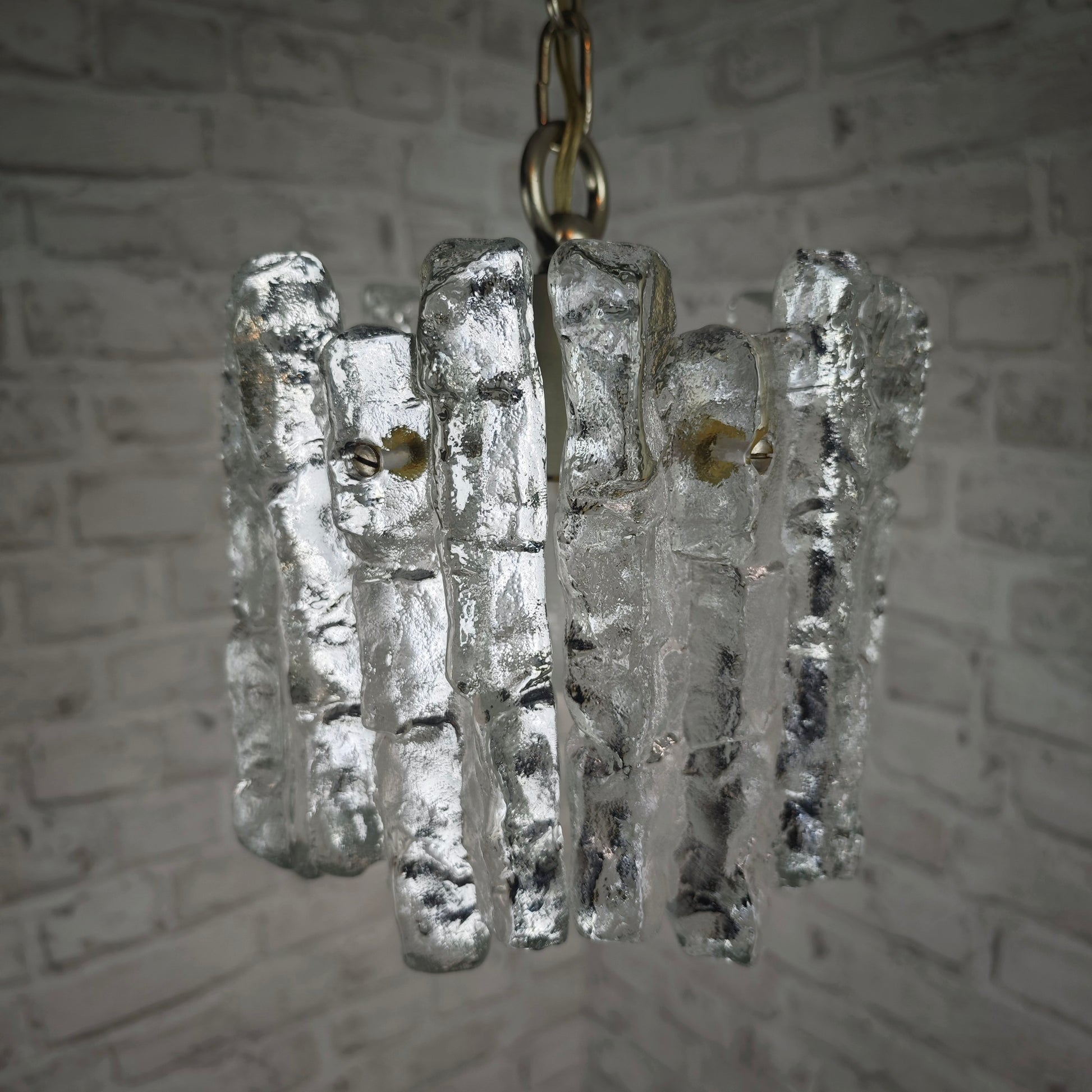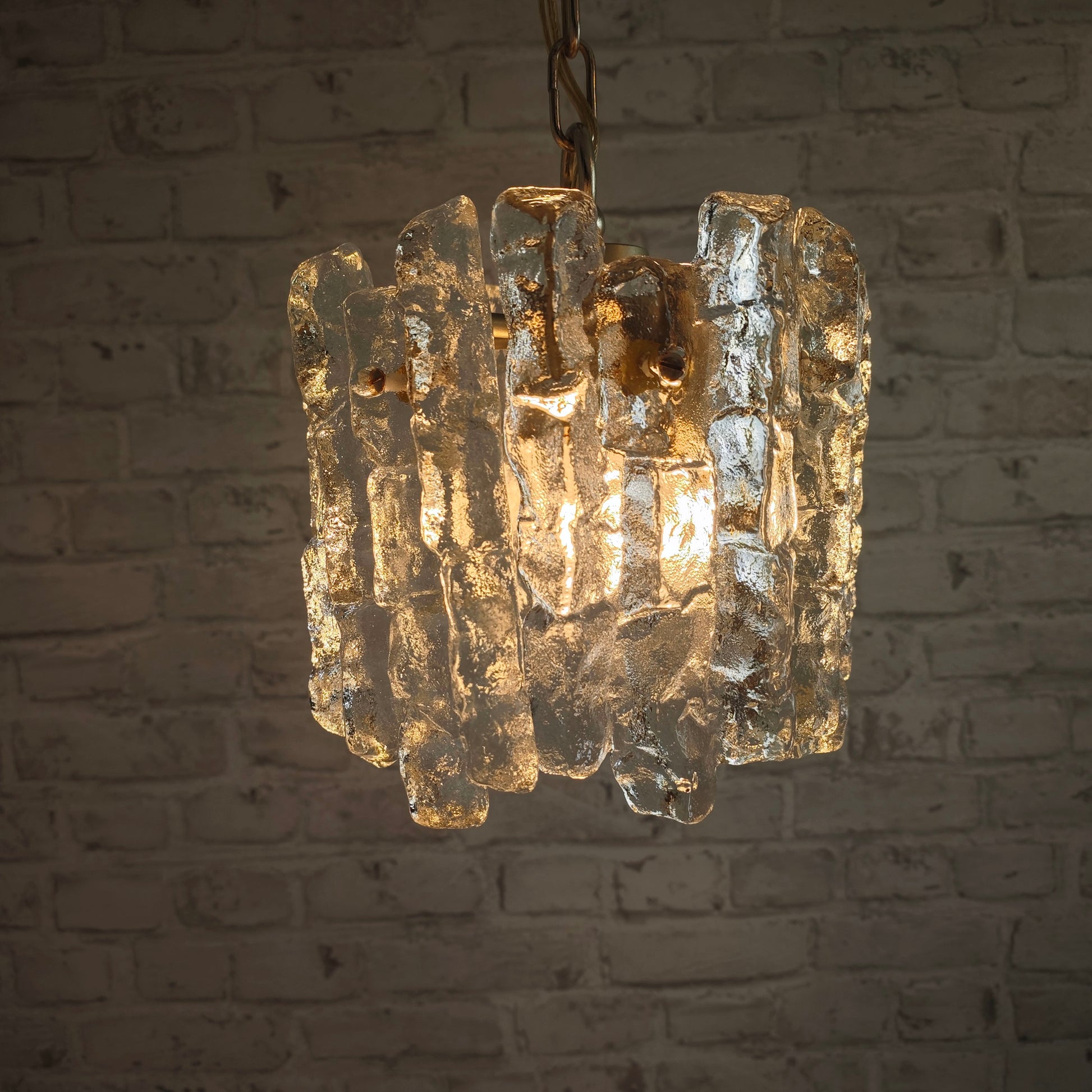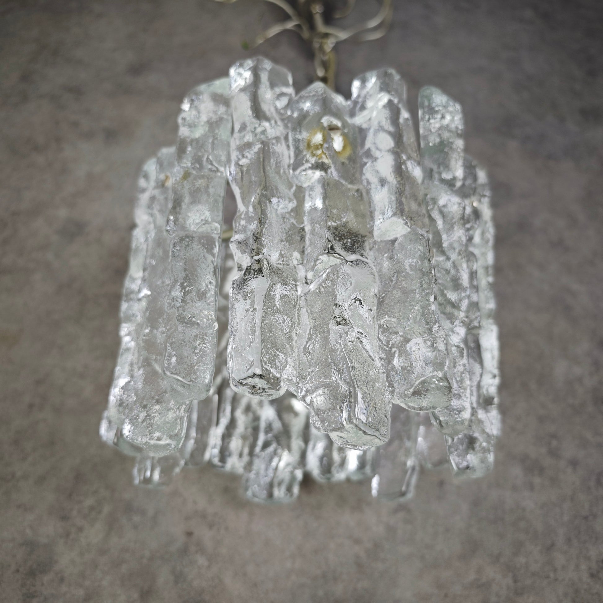 Diese Hängeleuchte von J.T. Kalmar aus den 1960er Jahren besticht durch ihre markante Gestaltung im Eisglas-Stil. Die einzelnen Glasstäbe wirken wie gefrorene Kristalle und verleihen der Lampe ein lebendiges Spiel von Licht und Struktur. Als Vintage-Leuchte ist sie ein schönes Beispiel für die Verbindung von funktionaler Form und dekorativer Oberfläche.